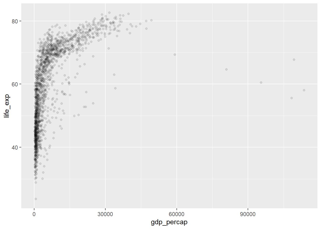 O argumento alpha= do geom_point( ) é útil para ver mais claramente a concentração da massa de dados.