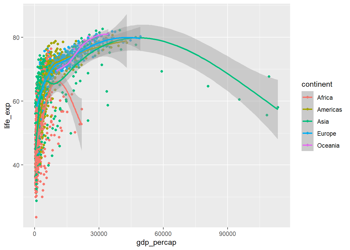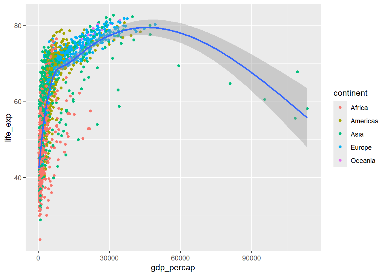 geom_point(colour = "gray") + #ao colocar a cor dos pontos a cor configurada segundo o continente no global não tem efeito nesta camada. Se não tivesse especificado a cor aqui, teria seguido as cores pela categorização de continente.