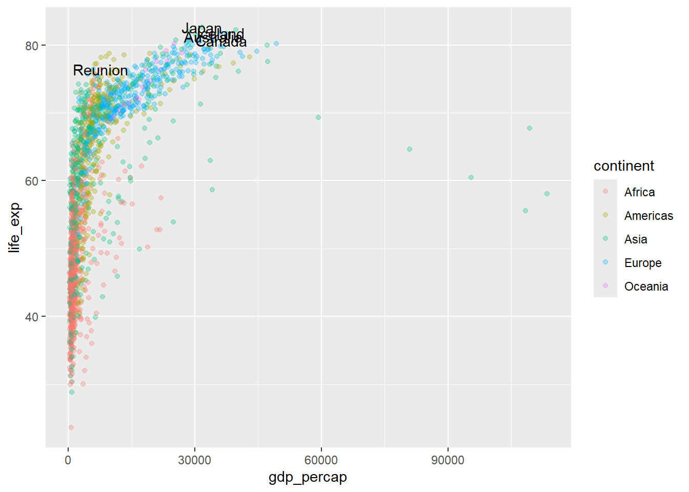 geom_point(aes(colour = continent), alpha = 0.3) +