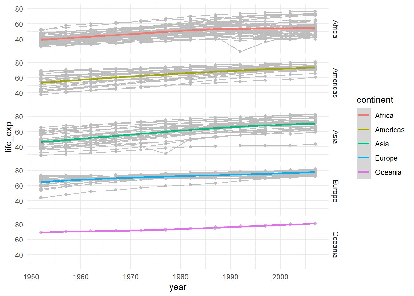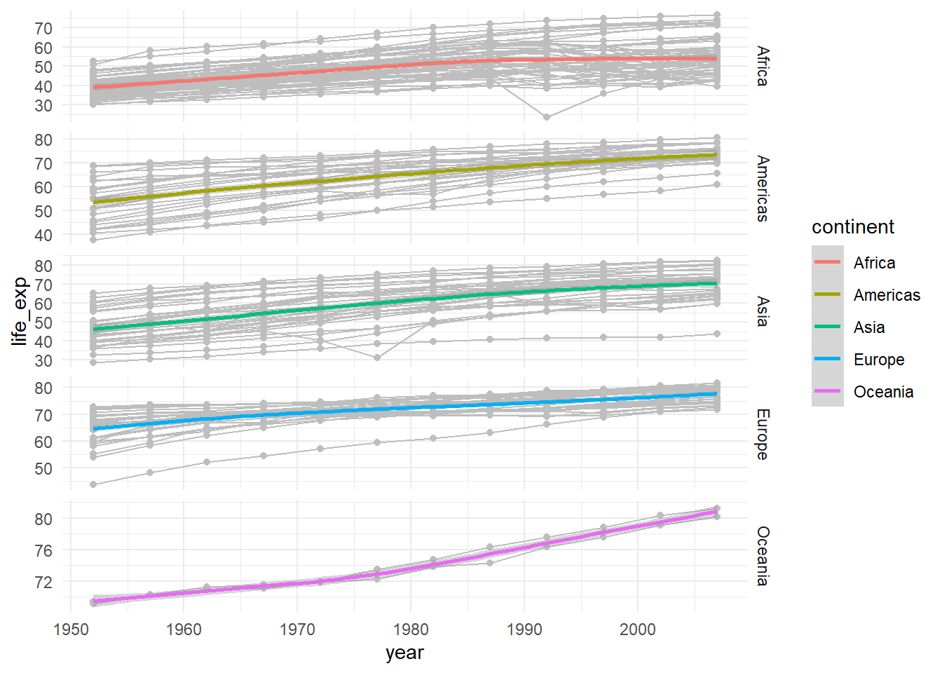 facet_grid(continent ~ ., scales = "free_y") # cria um eixo y para cada valor da categoria oferecida como argumento, no caso: continent. O argumento scales cria flexibilidade ou fixação dos eixos.